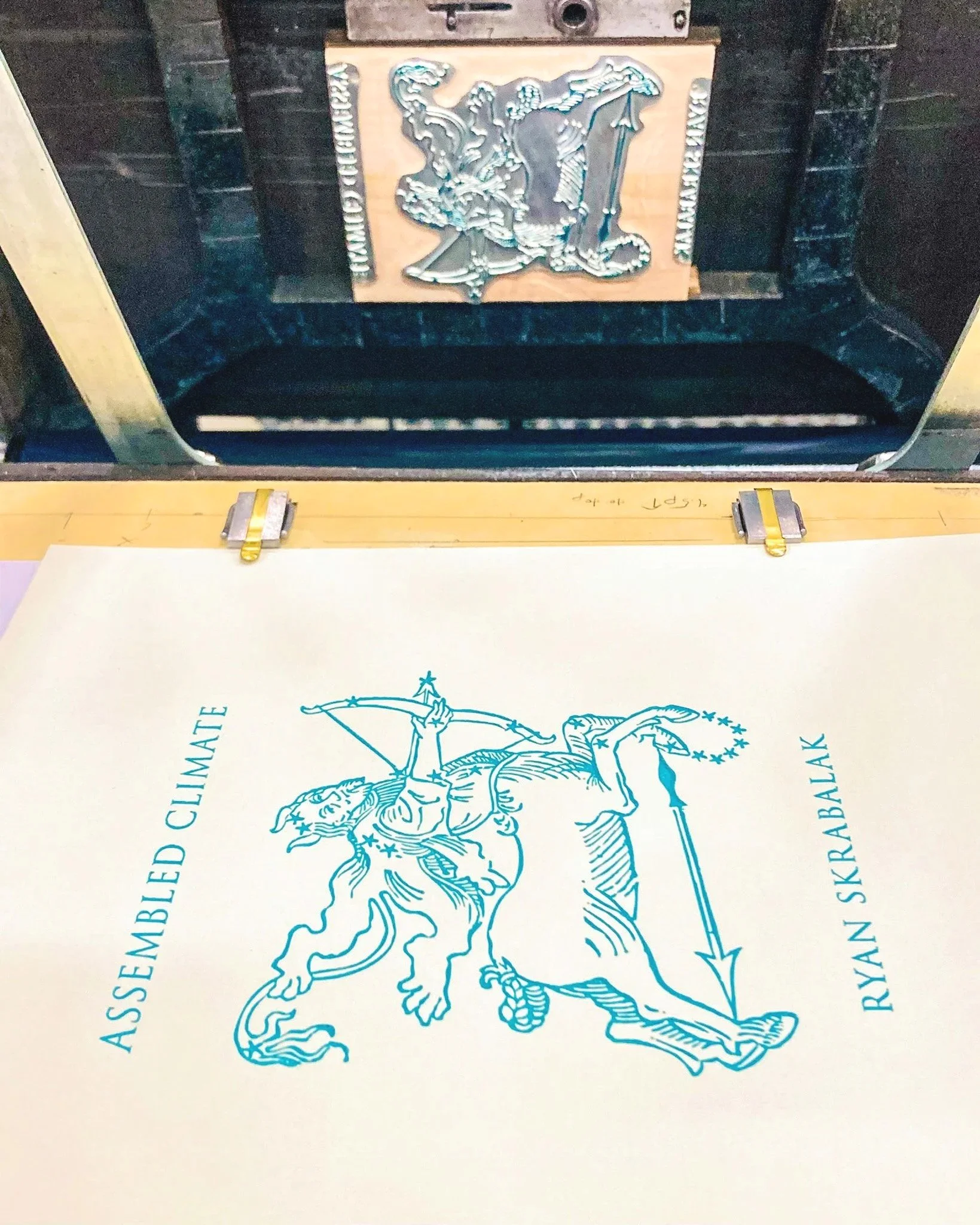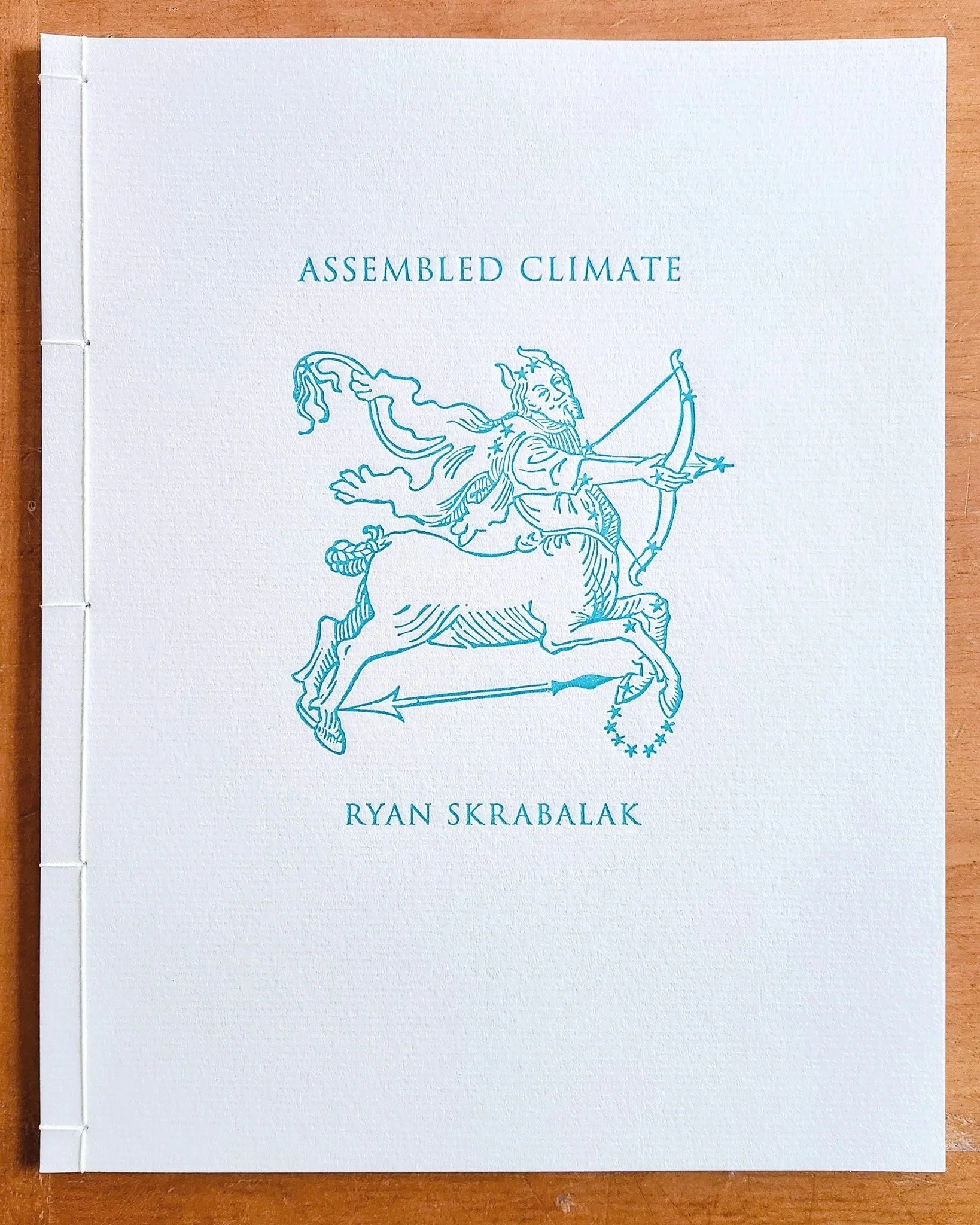 Hand-bound chapbook with letterpress printed covers. Stab binding. Laid-style papers with blue-raspberry end sheets.
